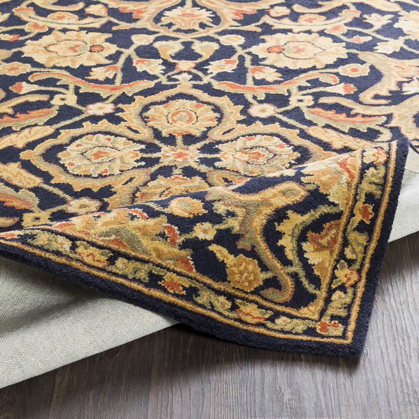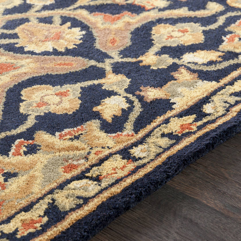 Made from 100% wool and featuring hand tufted construction, the Bearden Traditional Navy Area Rug combines durability with luxury. Its medium pile height ensures a comfortable and plush feel while being easy to maintain. The wool fibers provide natural resilience, making this rug perfect for high-traffic areas while retaining its beauty over time. The hand tufted construction ensures that each detail is carefully crafted to provide long-lasting quality and elegance.