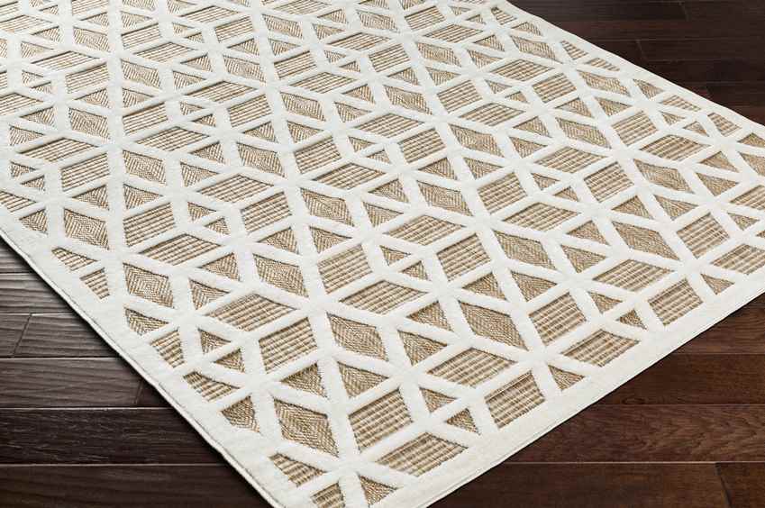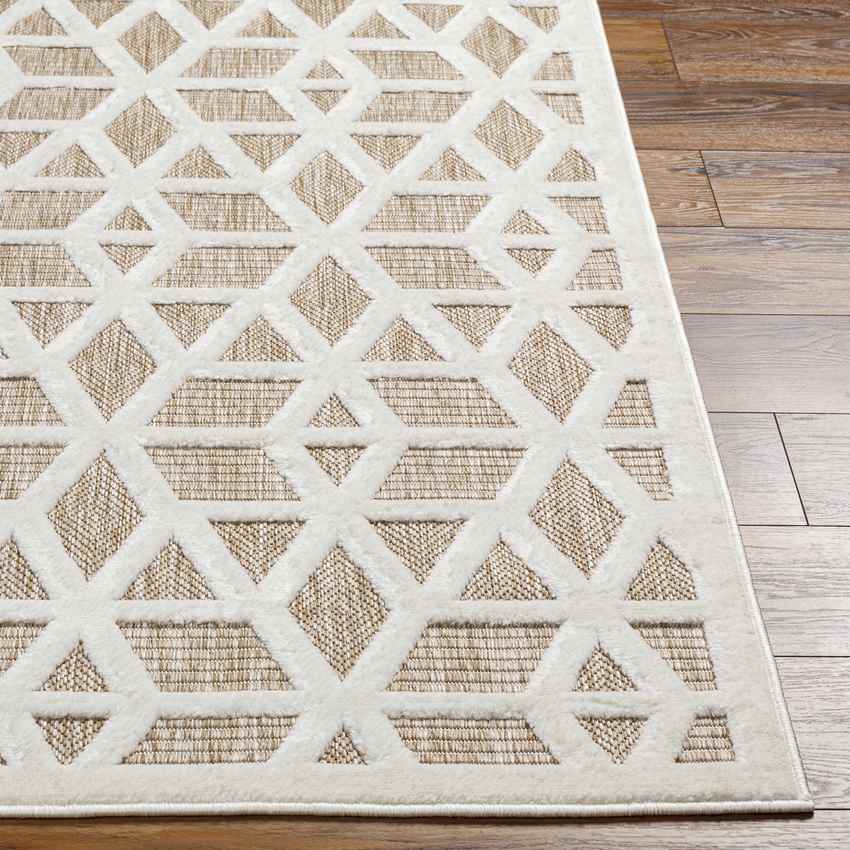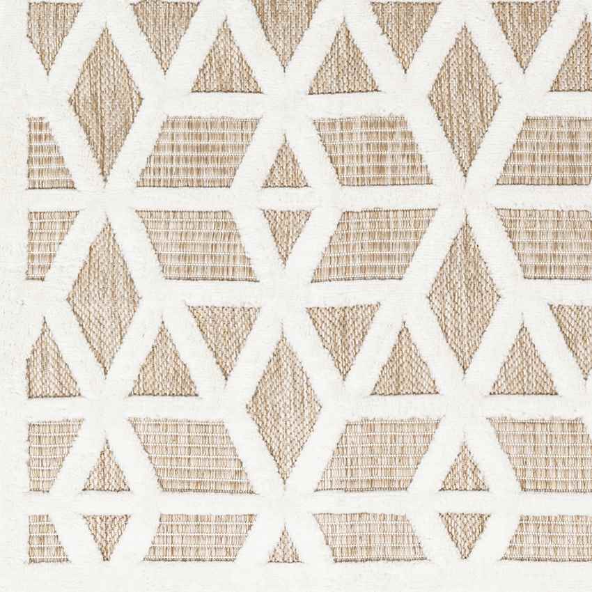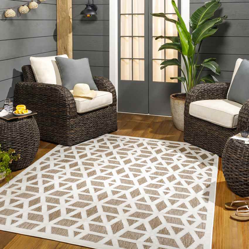 Designed with versatility in mind, the Bushton Rug transitions seamlessly between indoor and outdoor settings. Whether placed in a living room, dining area, or on your patio, its geometric pattern and neutral tones blend effortlessly with a variety of decor styles, adding a sophisticated touch wherever its used.