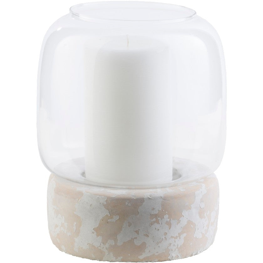Modern Form: Combines clear glass and a textured taupe ceramic base.