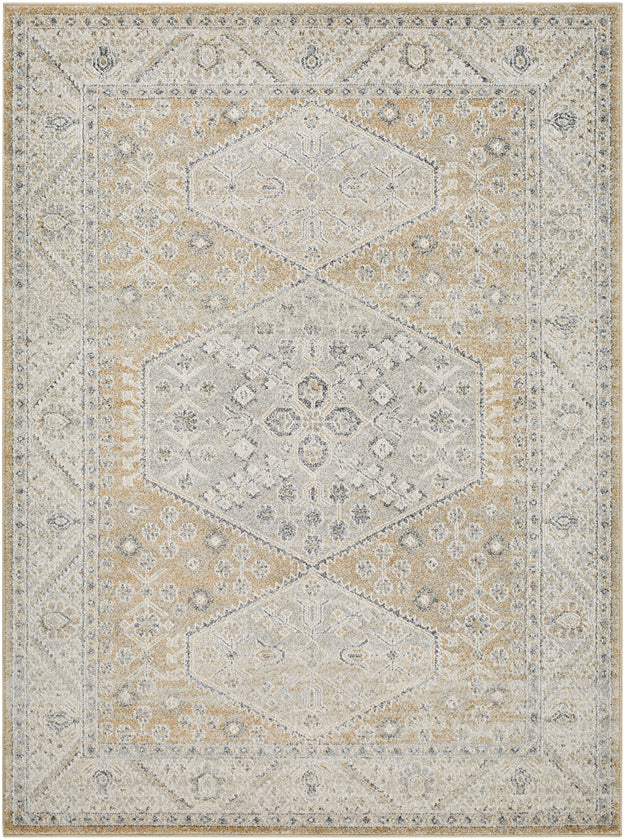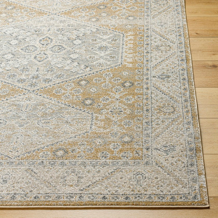 The Demarco Traditional Saffron Area Rug epitomizes timeless elegance and modern resilience, making it a stunning addition to any home. Featuring an intricate medallion pattern in light beige, cream, medium gray, amber, charcoal, and blue, this rug adds warmth and refined sophistication to your decor. Machine-woven in Turkey from 100% polypropylene, it provides a plush feel underfoot while ensuring lasting durability, making it an excellent choice for high-traffic areas without compromising on style.