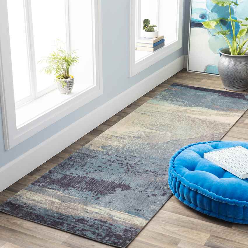 Playful and welcoming, Ellie Modern Sky Blue Area Rug will connect your living space to the relaxing aesthetics. Blues of its design create an airy ambience, while crisps of gray and khaki carry it to a rustic feel. You can reinforce the coziness by choosing paint colors, furniture and accessories all in a soft neutral color palette full of warm grays, browns and greens, forming a sophisticated silhouette of your taste. Crafted with stain resistant polyester, it is also an ideal choice for homes with kids and pets.