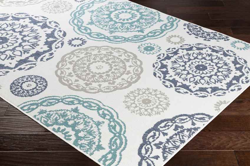 Add a touch of bohemian elegance to your home with the Ethan Cottage Teal Area Rug. Featuring a playful and ethnic-inspired medallion design in a soothing palette of teal, navy, white, and taupe, this rug brings warmth and character to any setting. Crafted from 100% Olefin and machine-woven in Egypt, it offers exceptional durability, making it ideal for high-traffic areas both indoors and outdoors. Its no-pile construction ensures easy maintenance, making it as practical as it is beautiful.