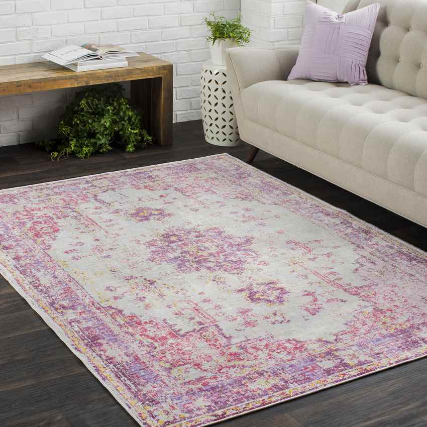 Infuse your space with the captivating charm of the Everly Traditional Bright Pink Area Rug. This stunning piece combines vintage artistry with modern appeal, featuring a faded, ancestral-inspired pattern that evokes the elegance of Eastern designs. With dreamy light pink strokes complemented by hints of red, lavender, light gray, and purple, the Everly Rug is a visual delight that becomes the perfect centerpiece for any room. Machine-woven in Turkey from 100% polyester, this rug is not only beautiful but also built for durability, offering a practical solution for busy homes.