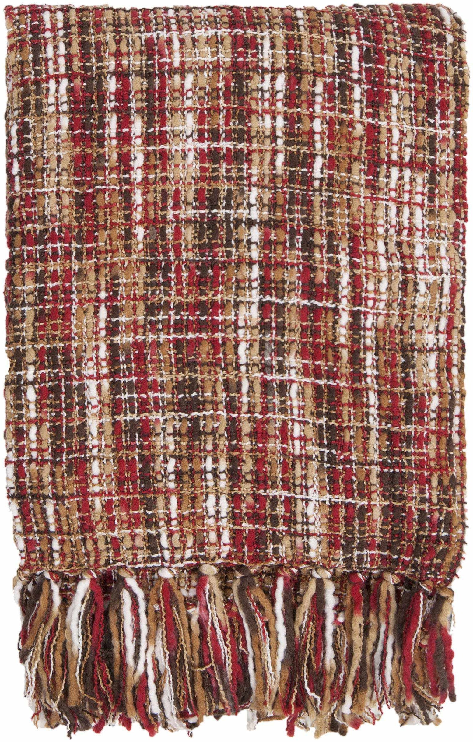 More than a blanket, Fraham Bright Red Throw offers an inspiring decor style. 5 inches in fringe length, this throw is woven and is made of the colors red, tan, white, camel and dark brown. It is a unique throw suitable for high-end decoration or usage.