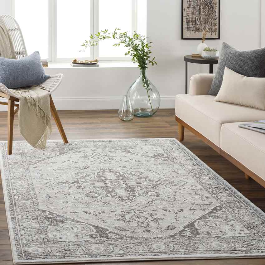 With a neutral yet striking color palette, this rug effortlessly complements various decor styles, from classic and transitional to modern and farmhouse aesthetics. Its detailed pattern creates an eye-catching focal point, while the subdued hues ensure seamless coordination with furniture and accessories. Whether anchoring a seating arrangement, adding warmth to a hardwood floor, or enhancing a formal space, the Griswold Traditional Gray Area Rug is a statement of refined style.