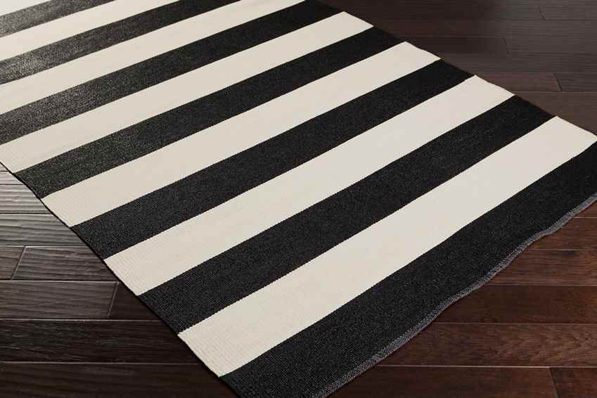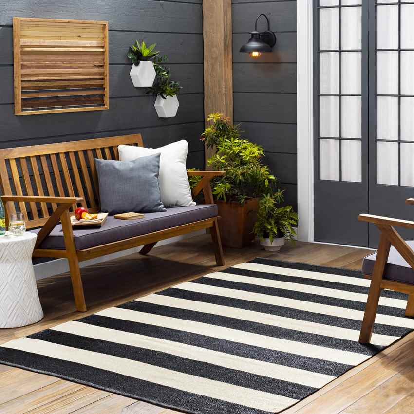 The Jolie Modern Black Area Rug combines minimalist design with timeless appeal. Its crisp black and cream stripes create a chic and versatile look that enhances any outdoor setting. Whether youre hosting a summer barbecue or enjoying a quiet evening on your patio, this rug sets the stage for unforgettable moments.