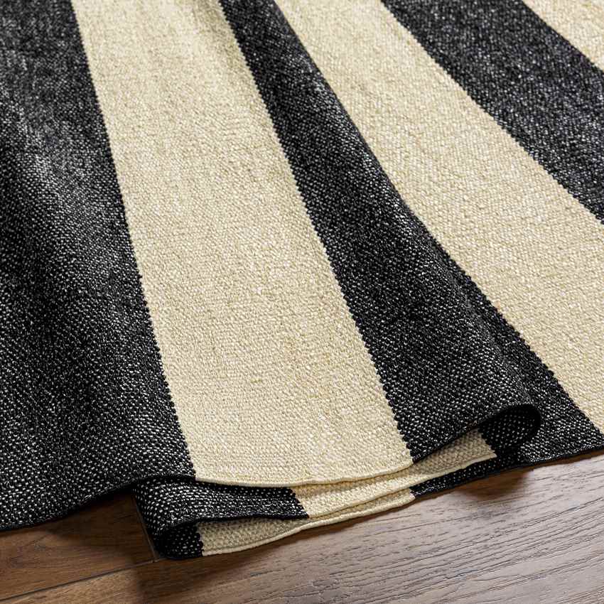 Elevate your outdoor spaces with the Jolie Modern Black Area Rug, a stunning fusion of bold design and exceptional durability. Hand-woven in India from 100% PVC, this weather-resistant rug stands as a testament to both craftsmanship and functionality. Its dynamic black and cream striped pattern adds a touch of modern sophistication, creating a visually striking centerpiece that enhances patios, decks, balconies, and backyards. Perfectly blending form and function, the Jolie rug brings contemporary elegance to your outdoor decor with ease.