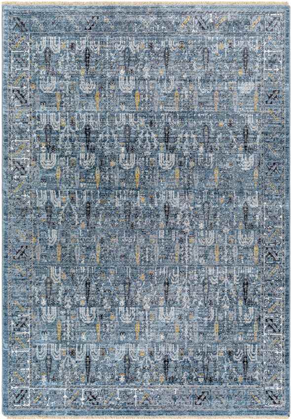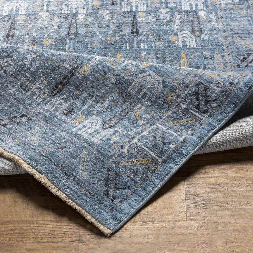 The Komurcu rug is more than just floor dcor-its a statement piece. The combination of dark teal and blue tones creates a dramatic foundation, while ivory and gray details offer contrast and clarity. The vintage-style pattern evokes an old-world charm that feels right at home in both modern and traditional interiors. Whether your space is filled with antiques or sleek furnishings, this rug ties everything together with timeless grace.