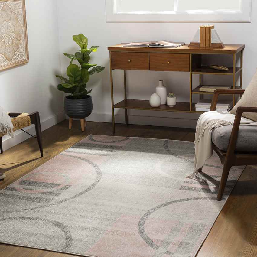 - Colors: Light Pink, Medium Gray, Charcoal, Light Slate, Cream