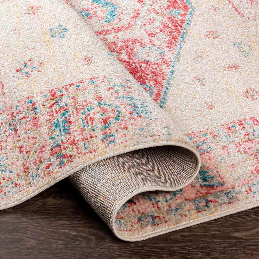 The Kreek Traditional Coral Area Rug is equipped with vibrant colors. It combines the unique harmony of pink and blue with traditional motifs. It has a thin structure.