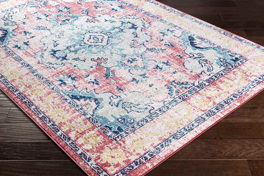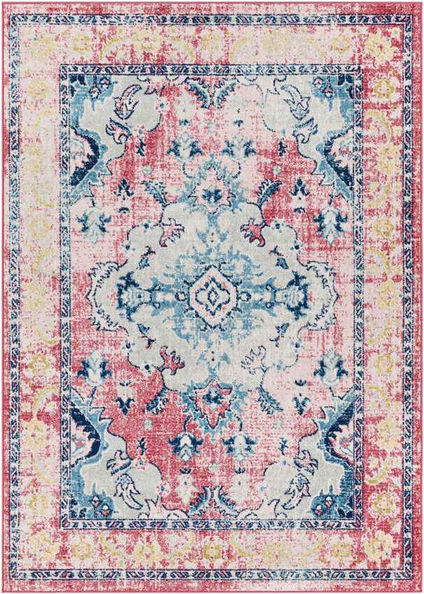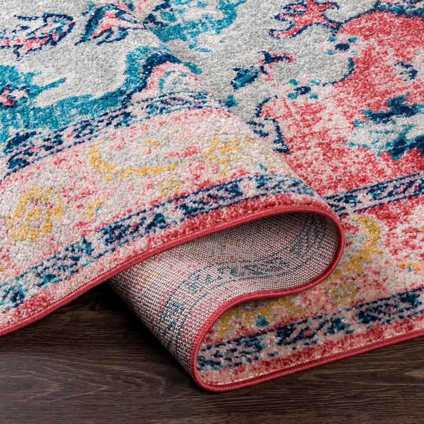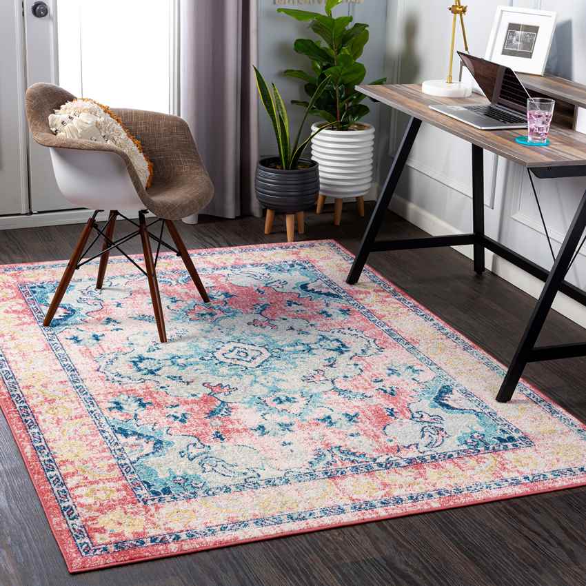 Kreijl Traditional Coral Area Rug contains vibrant colors. It is equipped with pink, blue, yellow and greens. It is stain resistant.
