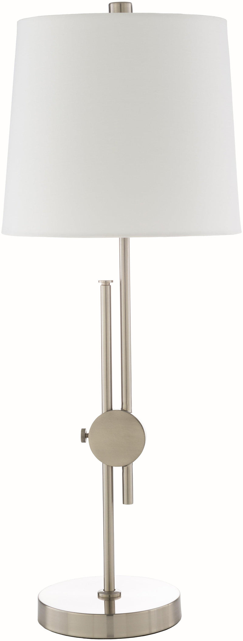 Product Specifications: Material: Polyester, Metal Style: Modern Color: Body: Metallic - Nickel; Base: Metallic - Nickel; Shade (Outside): Ivory; Shade (Inside): White; Finial: Metallic - Nickel; Harp: Metallic - Nickel; Cord: Translucent Made in China Nickel Antiqued Metal Body Off-Body: Metallic - Nickel; Base: Metallic - Nickel; Shade (Outside): Ivory;...