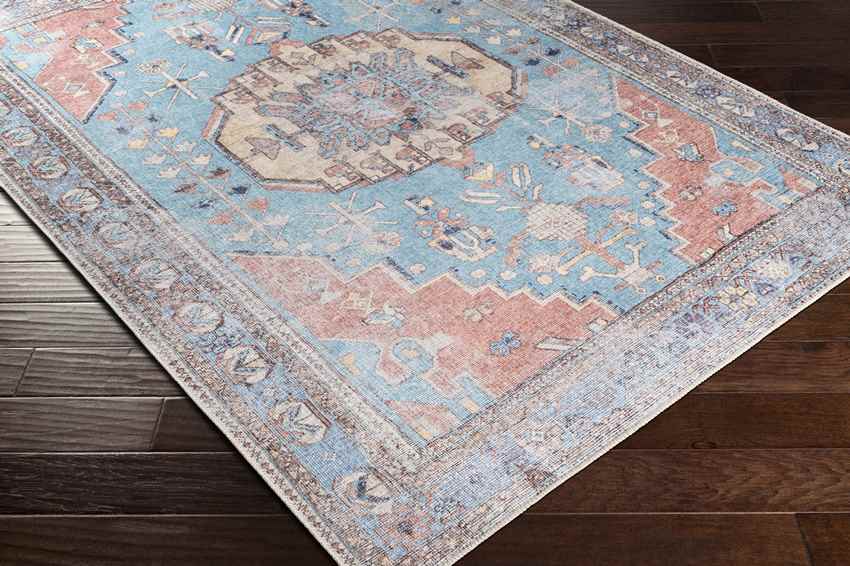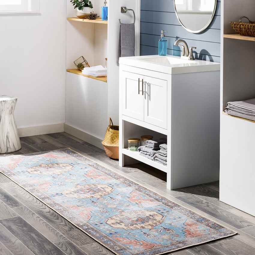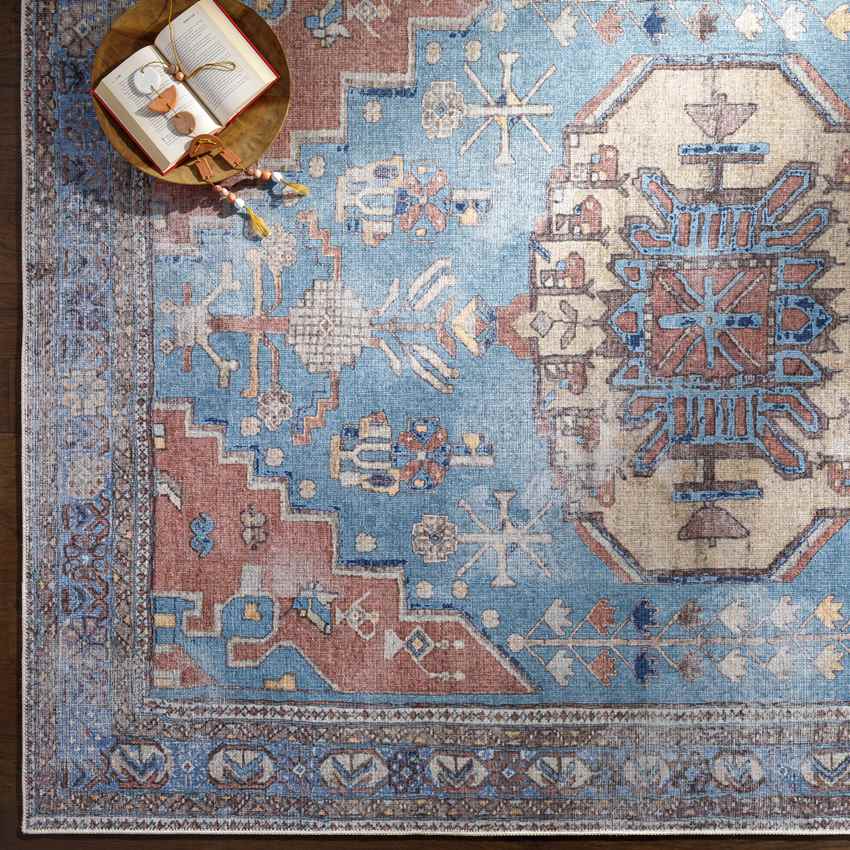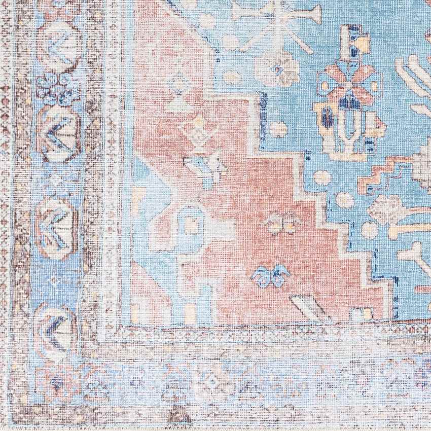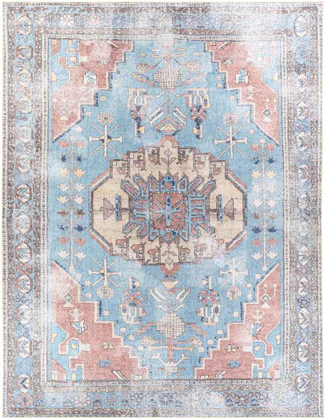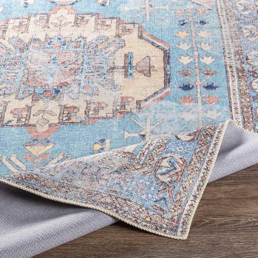 Durability meets sophistication with this machine-woven masterpiece. The low-pile construction minimizes shedding, making it perfect for busy households, while the stain-resistant material ensures longevity without compromising on beauty. Ideal for high-traffic areas like hallways, entryways, and family rooms, the Laren Traditional Aqua Washable Area Rug is made to withstand everyday wear and tear with ease.