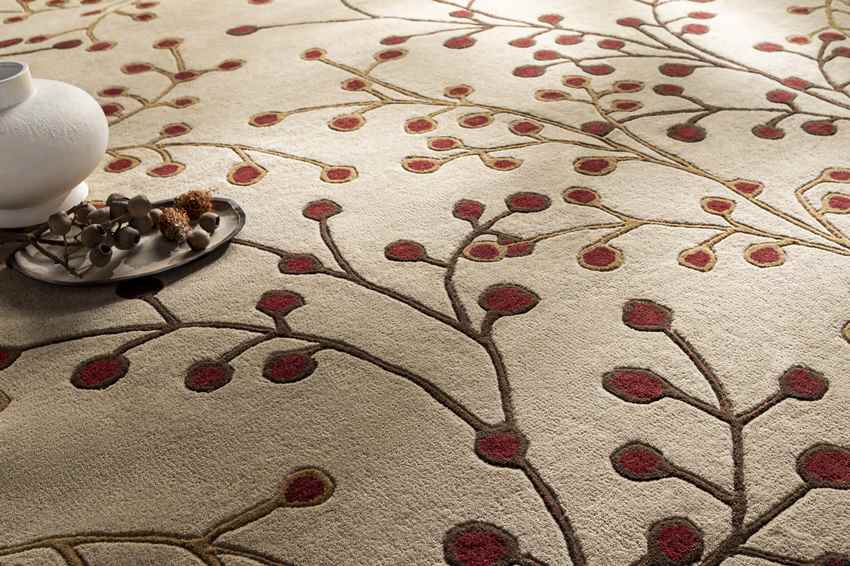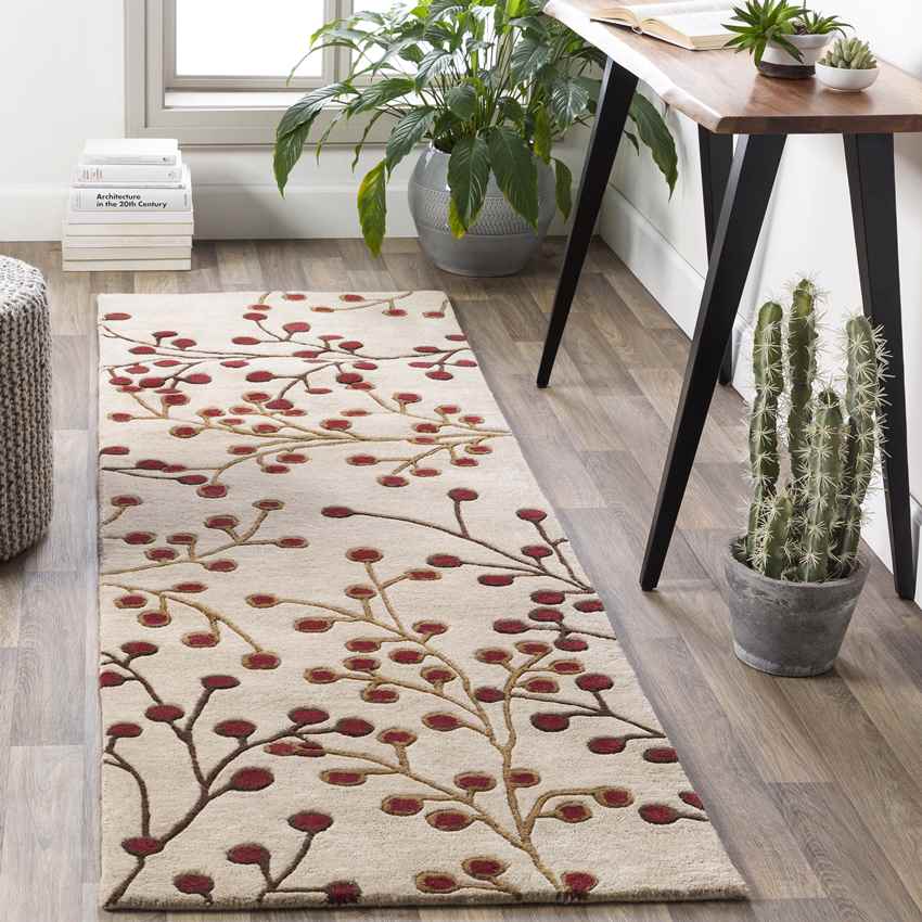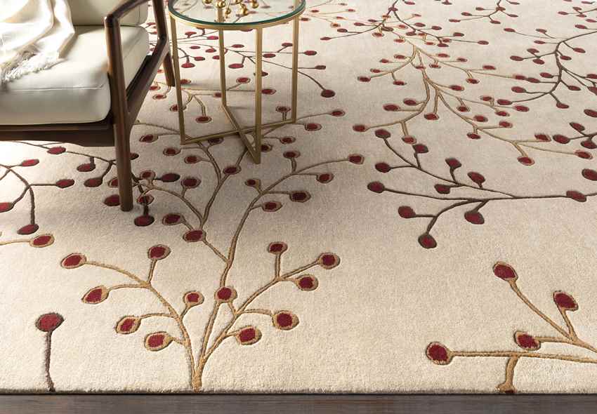 Bring a breath of fresh, pastoral charm into your home with the Le Havre Cottage Camel Area Rug. This rug isn't just a floor covering; it's a piece of art that blends rustic elegance with a touch of whimsy. Hand-tufted in India from the finest wool, this rug features a unique high/low construction that creates a captivating textural dimension. The delicate, vine-like patterns, adorned with rich burgundy and earthy brown dots, gracefully traverse the soft, camel-toned background, creating a visually compelling centerpiece. The Le Havre Cottage Camel Area Rug offers both aesthetic appeal and a luxurious feel underfoot, making it a perfect addition to any room seeking a blend of comfort and style.
