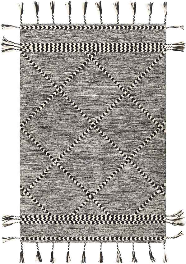 Elevate your home decor with the Leyton Global Black Area Rug, a striking blend of modern sophistication and global-inspired charm. Featuring a black and cream tribal pattern, this hand-tufted wool rug creates a bold focal point while maintaining a versatile and timeless aesthetic. The intricate high/low texture and handcrafted fringe detailing enhance its artisanal appeal, making it the perfect foundation for contemporary, bohemian, and eclectic spaces alike. Whether placed in a living room, bedroom, or entryway, this rug effortlessly balances style, durability, and comfort.