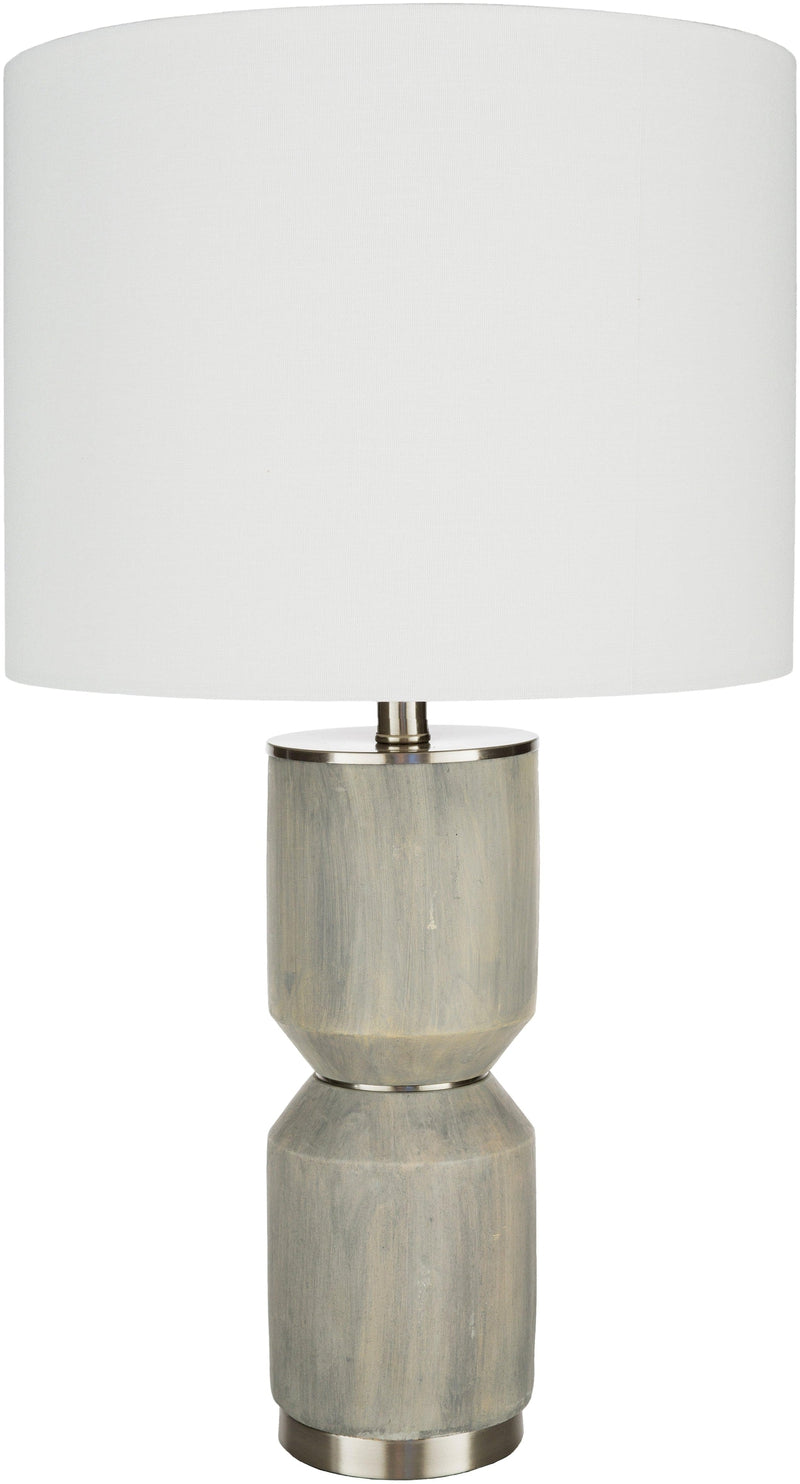 Product Specifications: Material: Linen, Concrete, Metal Style: Traditional Color: Body: Medium Gray; Base: Metallic - Nickel; Shade: White; Finial: Metallic - Nickel; Harp: Metallic - Nickel; Cord: Translucent Made in China Medium Gray Distressed Concrete Body White Linen Shade Brushed Polished Metal Base Metal Finial Cord Length: 6' Switch Type:...