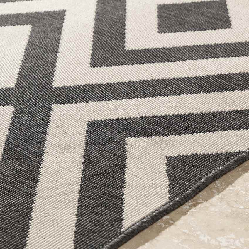 Elevate your home decor with the Maya Modern Black Area Rug, a stunning geometric piece that brings contemporary flair and versatile functionality to any space. Featuring bold black and beige diamond patterns, this Scandinavian-inspired design creates a striking visual impact, ideal for both indoor and outdoor settings. Made in Egypt with 100% Olefin, this rug is perfect for high-traffic areas and built to withstand the elements, making it a stylish and practical choice for patios, decks, and living areas alike.