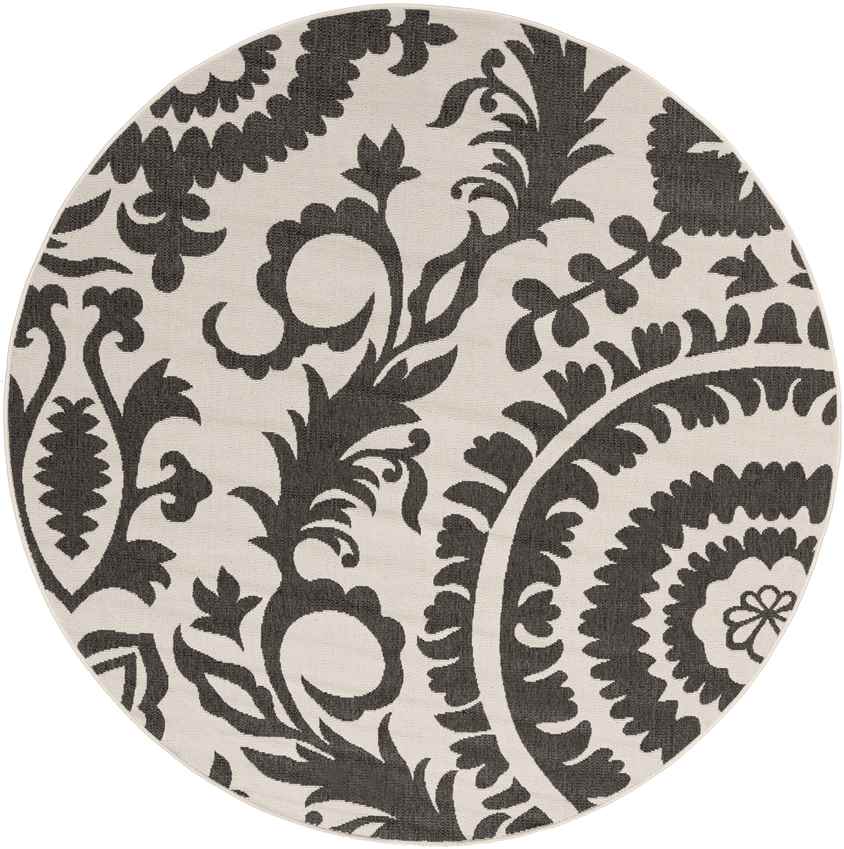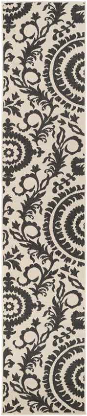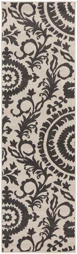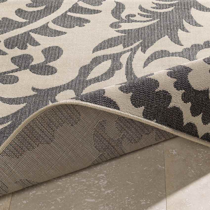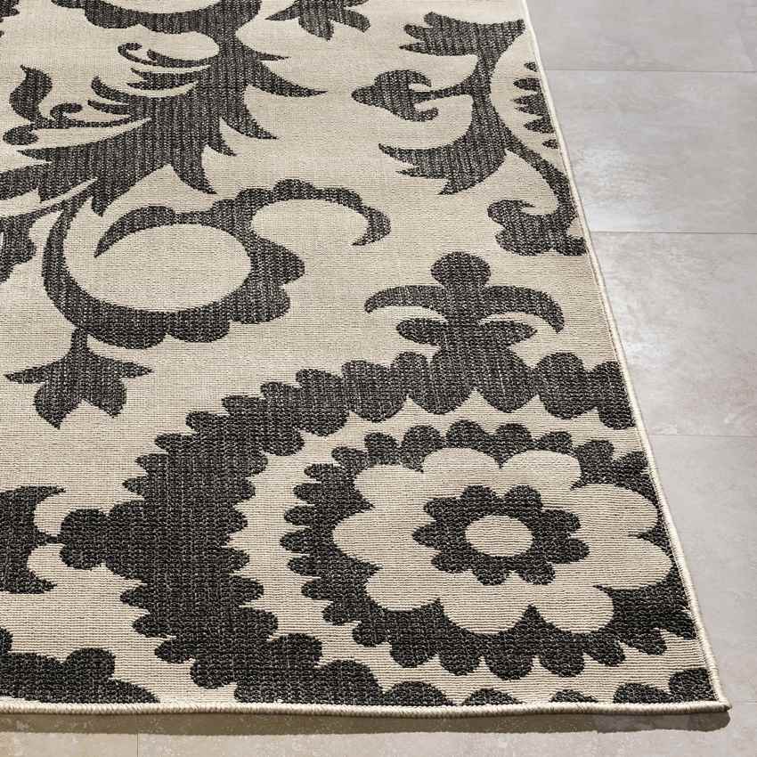 Elevate your home decor with the Nancy Cottage Cream Area Rug, a stunning fusion of timeless charm and modern functionality. Featuring an intricate black floral pattern against a soft cream backdrop, this rug blends traditional aesthetics with contemporary practicality. Machine-woven in Egypt from 100% Olefin, this piece is built to withstand the test of time, making it a versatile choice for both indoor and outdoor spaces. Its sleek, no-pile design ensures a clean, sophisticated look, while its durable construction makes it perfect for high-traffic areas in your home or patio.