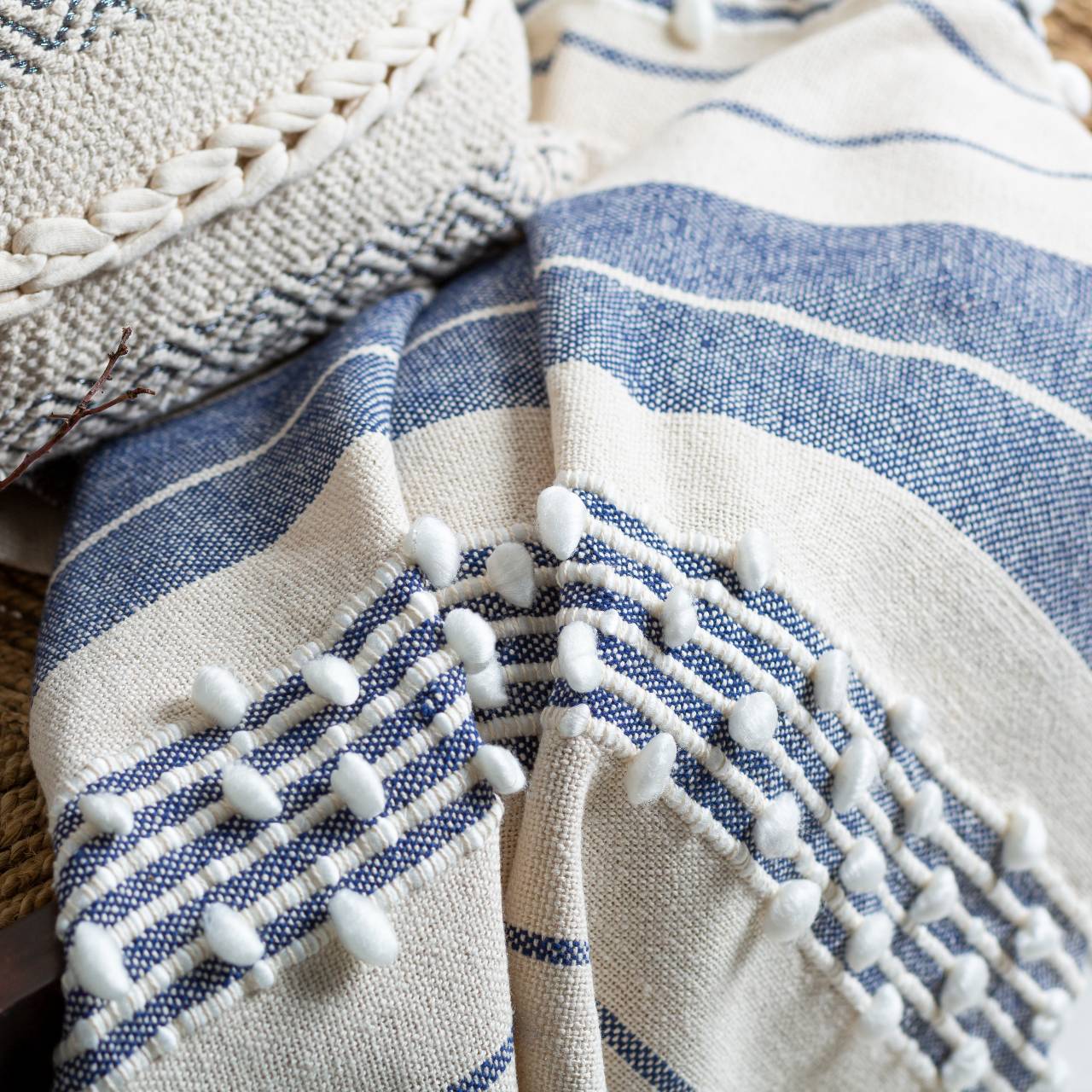 Nebelberg Cream Throw has a very coastal vibe to it. It can be combined with cream, brown, and black furniture to achieve a high-end look. This throw is 85% cotton and 15% acrylic with a hand woven construction.