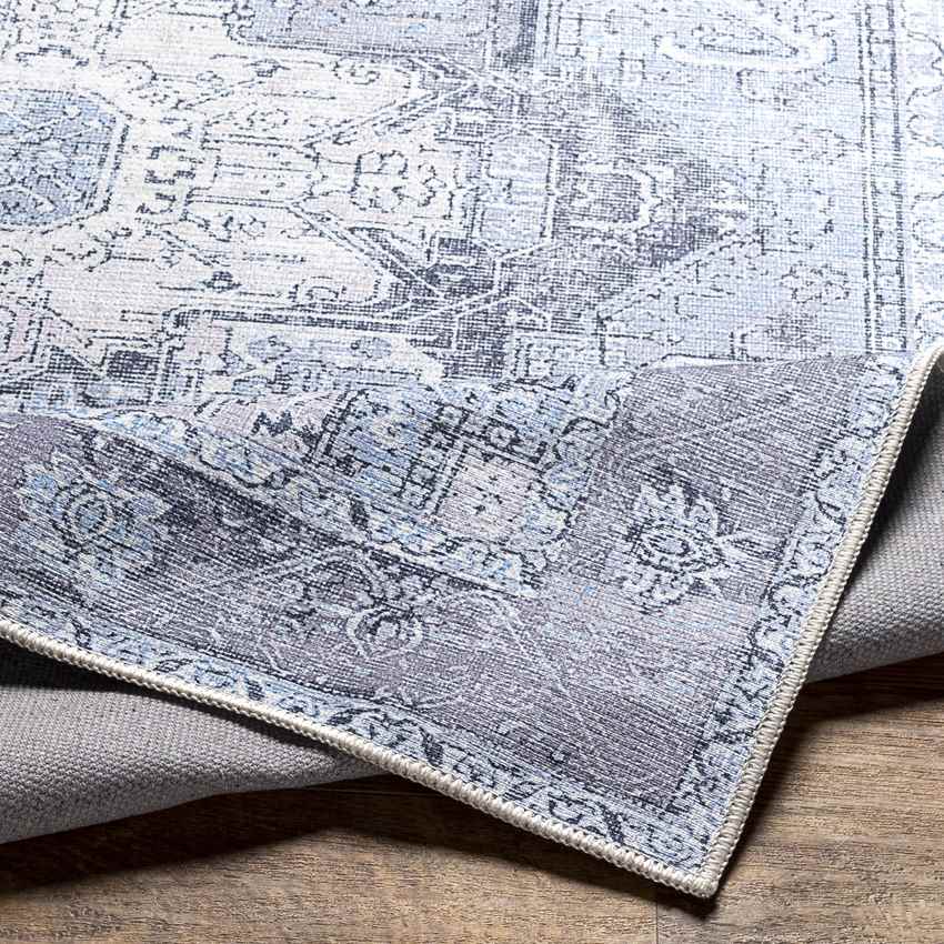 Infuse your home with a sense of tranquility and timeless style with the Nora Traditional Sky Blue Washable Mandala Area Rug. This updated traditional rug, featuring a captivating mandala design, is crafted from a durable blend of chenille-polyester and cotton, ensuring both comfort and longevity. Its machine-woven construction and no-pile design make it perfect for high-traffic areas, while its soothing palette of light gray, denim, lavender, sky blue, and navy adds a touch of serene elegance to any space. Made in Turkey, the Nora rug is designed for easy care, allowing you to maintain its beauty with minimal effort.