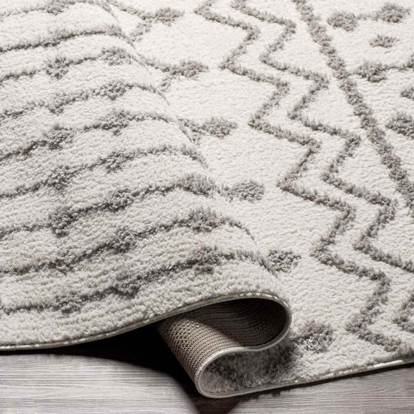 Infuse your home with elegance and comfort with the Rocky Ripple Bohemian/Global Pale White Area Rug. This stunning rug showcases a delicate light gray and cream color palette, perfect for creating a soothing ambiance in any space. Its 100% polyester construction makes it stain-resistant, kid- and pet-friendly, and ideal for high-traffic areas in busy households. With a high-pile design measuring 0.79 inches thick, this rug provides unmatched plushness underfoot, adding both sophistication and comfort to your living room, bedroom, or any cozy nook.