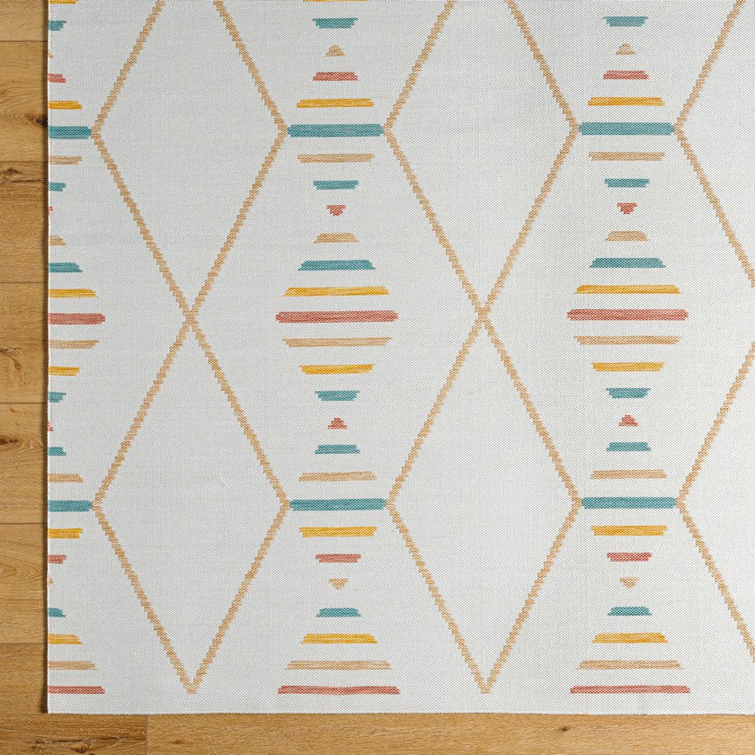 Elevate your decor with the vibrant charm of the Ronrico Coastal Rust Saffron Area Rug. Machine-woven in Turkey, this stylish piece features a captivating bohemian-inspired diamond pattern in a refreshing palette of off-white, pale blue, light brown, mustard, and rust. Crafted from durable polypropylene with a practical no-pile construction, this rug is an excellent choice for high-traffic areas and is even safe for outdoor use. Maintaining its beauty is simple: just hose it off with water and hang it to dry. For added cushioning and to protect your floors, we recommend using a rug pad underneath. Bring a touch of bohemian elegance to your home with this eye-catching rug!