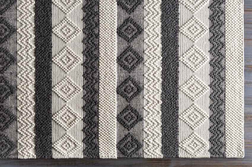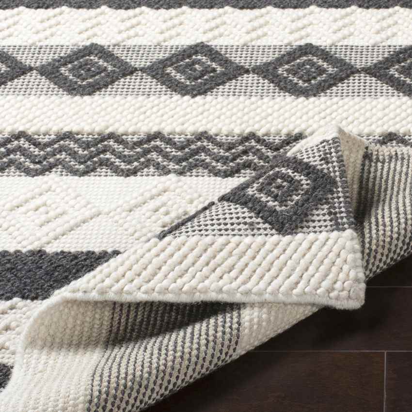 100% wool Selmian Bohemian/Global Charcoal Area Rug is a handmade like look formed of zigzags and squares in soothing, pure color tones. This classy and bohemian area rug is the road to ultimate decoration if you are aiming for a relaxing atmosphere in your home.