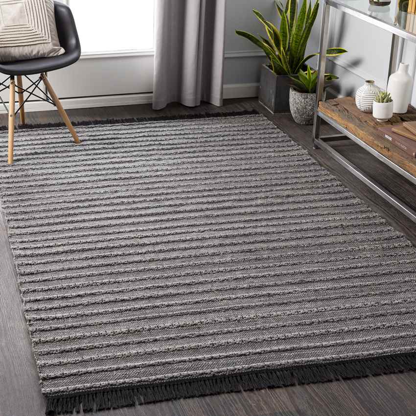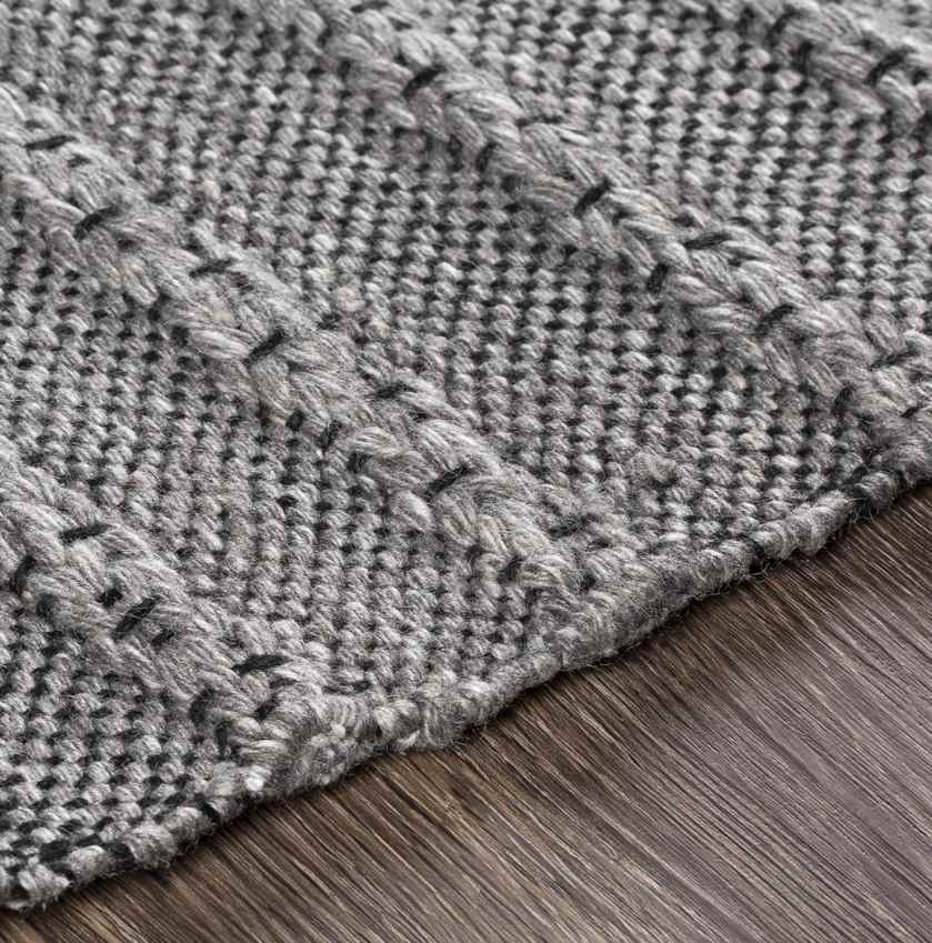 Constructed from 100% PET yarn and hand-woven for quality, the Smerp Modern Medium Gray Area Rug is designed to withstand the demands of everyday life. PET yarn is not only durable and resilient but also a sustainable choice, made from recycled materials. The no-pile design further enhances its practicality, making it incredibly easy to clean and maintain a perfect combination for busy households with kids and pets. This rug offers a stylish and environmentally conscious flooring solution that doesn't compromise on comfort or durability.