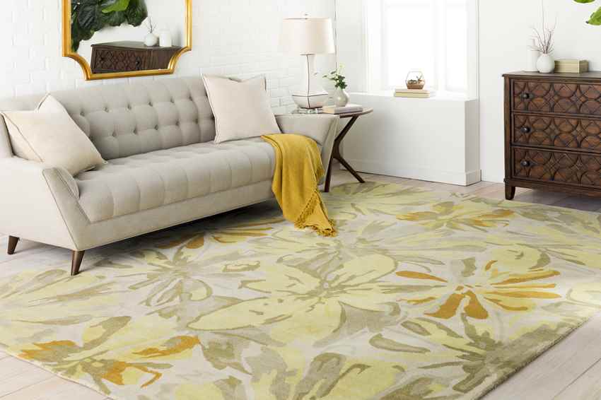 Transform your living space into a haven of serene elegance with the Toulon Cottage Lime Area Rug. This rug isn't just a floor covering; it's a piece of tranquil artistry, designed to bring a touch of cottage-inspired sophistication to your home. Hand-tufted in India from 100% wool, this rug features a medium pile for added comfort and style. The soft, blurry floral pattern, rendered in soothing limes, taupes, and ivories, creates a calm dynamism that beautifully complements any decor. The Toulon Cottage Lime Area Rug offers both aesthetic appeal and a luxurious feel underfoot, making it a perfect addition to any room seeking a blend of comfort and style.