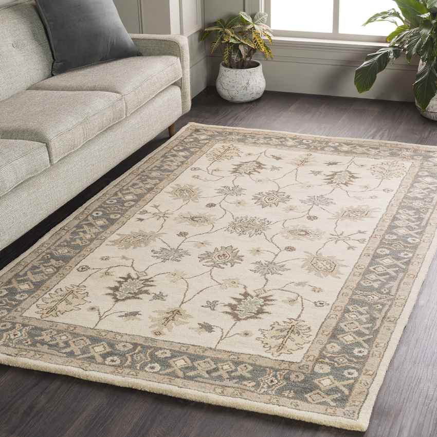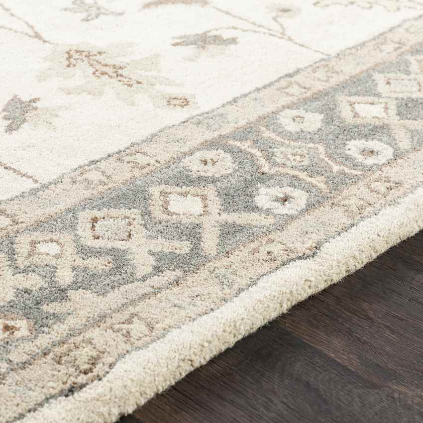 The Trappes Traditional Khaki Area Rug is a perfect blend of classic charm and modern functionality. Hand tufted in India from 100% wool, this rug features a warm and earthy color palette of light beige, charcoal, light brown, dark brown, and taupe tones, with accents of ivory, medium gray, and beige. Its rich, nostalgic design offers a timeless feel that complements various home dcor styles, making it an ideal addition to your living room, bedroom, or hallway.