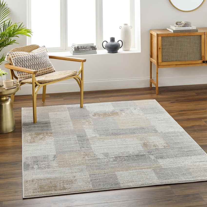 Designed to adapt to various decor styles, this rug offers a versatile aesthetic that complements both modern and traditional settings. Its harmonious blend of colors, including charcoal, tan, off-white, plum, dusty pink, and navy, creates visual interest and adds depth to your interiors. The Treavor Modern Light Gray Area Rug is perfect for any room, whether it is a bustling family area or a serene retreat.