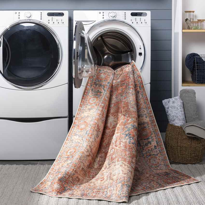 Machine-washable for effortless maintenance and long-lasting freshness Stain-resistant surface repels spills and dirt, ensuring easy cleaning Kid-and-pet-friendly, making it a durable choice for high-traffic areas A rich color palette of burnt orange, peach, dark blue, denim, and light beige for a warm, sophisticated aesthetic Low pile (0.04 inches) for a sleek, easy-to-clean surface that fits under furniture Machine-woven in Turkey from 100% chenille-polyester for a soft, durable finish