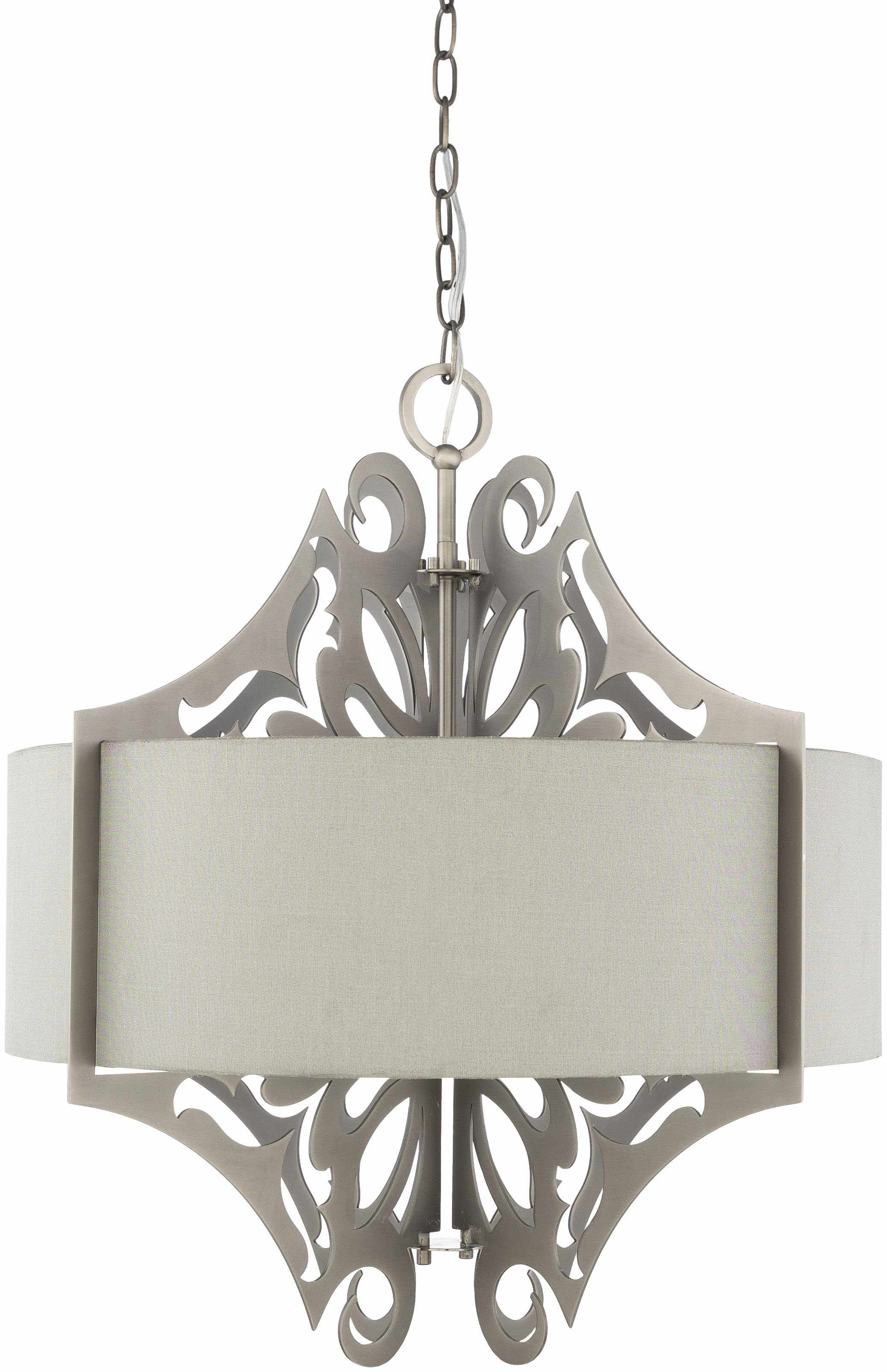 Product Specifications: Material: Linen, Polyester, Metal Style: Modern Color: Fixture: Metallic - Pewter; Base: Metallic - Nickel; Shade (Outside): Gray; Shade (Inside): White; Cord: Translucent Made in China Pewter Brushed Metal Fixture Gray Linen Shade 3 Light Pendant Hanging Method: Chain Hanging Method Length: 48" Adjustable Hanging Method Cord Length:...