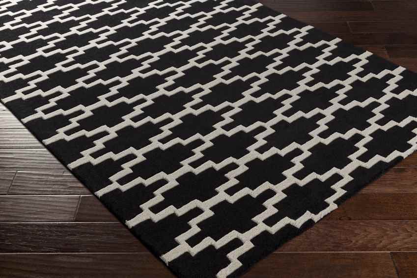 Introducing the Ziek Modern Black Area Rug, a simplistic yet compelling piece that effortlessly embodies the essence of modern dcor. With its hand-tufted construction, this rug offers an affordable alternative to other handmade options while preserving the same natural charm and appeal. Crafted in India from 100% wool, it features a comfortable medium pile. The striking geometric design in contrasting black and cream (ivory) creates a bold and contemporary statement in any space. Easy to maintain with spot cleaning and backed by a one-year limited warranty, the Ziek Modern Black Area Rug is a stylish and practical addition to your home.